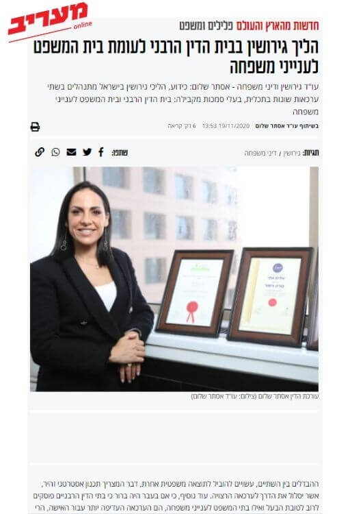 עורכת דין ומגשרת אסתר שלום, מתמחה בדיני משפחה, הליכי גירושין ונדל”ן.